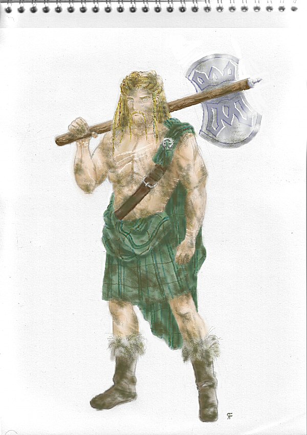 Ansgar ist ein etwa 2,00 Schritt grosser,junger Barbar aus den Tiefen der Gjalskerlande. Man könnte ihn auf ungefähr 20 Götterläufe schätzen.Seine Mähne ist blond und schulterlang, die Augen von einem stechenden, aber nicht boshaftem Eisblau.Wenn es gar zu kalt wird trägt er noch zusätzlich zu seinem Kilt Felle, und es kann verdammt kalt werden, wenn man im Freien lebt.