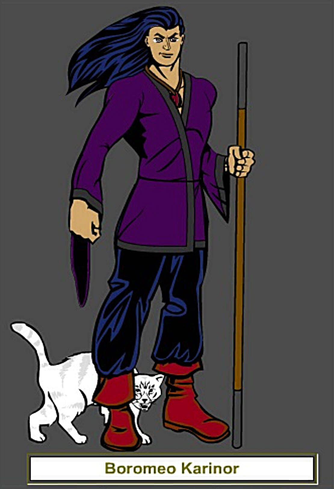 Boromeo ist 1,80 m groß, hat blauschwarze wallende schulterlange Haare, eisgraue Augen, einen dunkleren Teint und sieht nicht älter aus als 25 Götterläufe. Er trägt dunkelrote Iryanlederstiefel, eine samtene schwarze, enganliegende Hose und darüber einen Mantel aus violettem Samt. Der Mantel ist vorn offen und wird auf der Brust geschnürt(Brustfrei). Außerdem geht der Mantel bis unter die Knie, wird ab der Hüfte weiter und hat lange weite Ärmel. An den Händen trägt er einige Ringe aus Silber und Gold und um den Hals eine Kette mit einem Rosenquarz. Immer dabei hat er eine dunkelbraune Schultertasche, einen mit Eisen beschlagenen Kampstab, einen schwarzen SamtKapuzenumhang, und natürlich eine weiße Al'AnfanerKatze (langes weißes Fell und hellblaue Augen, unter Fell sehr zierlicher Körper).